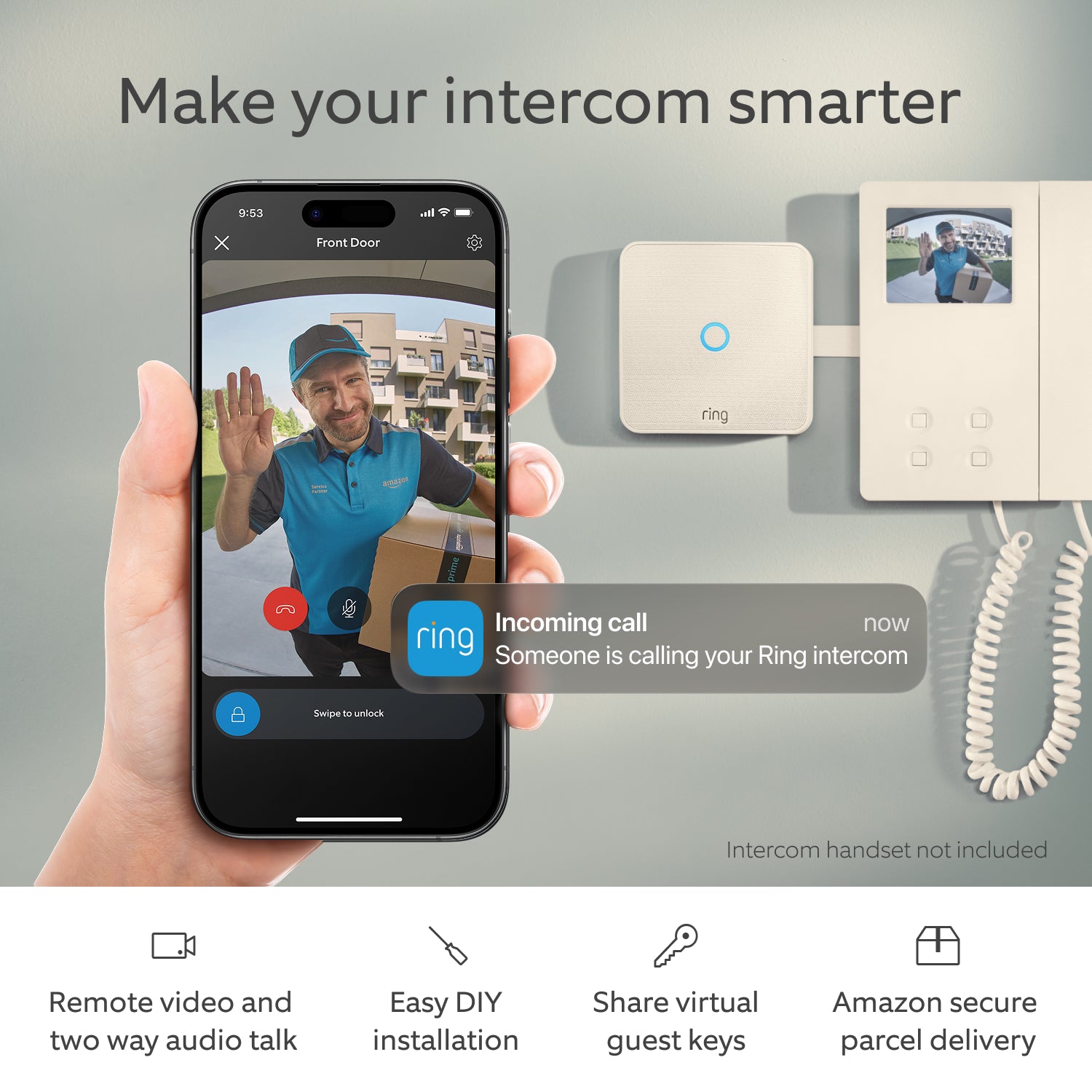 Upgrade your compatible video intercom handset, so you can speak to whoever is at your building entrance and buzz them in using the Ring app (compatible intercom required).